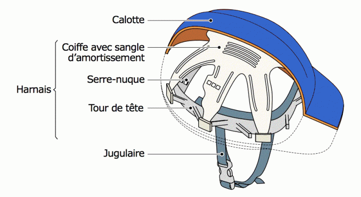 - Harnais et bandeau de maintien qui servent à maintenir le casque en place sur la tête. Le harnais a un rôle d’amortisseur lors d’un choc. Le bandeau anti-sueur empêche la descente de la sueur sur le visage et les risques de glissade du casque sur la tête.