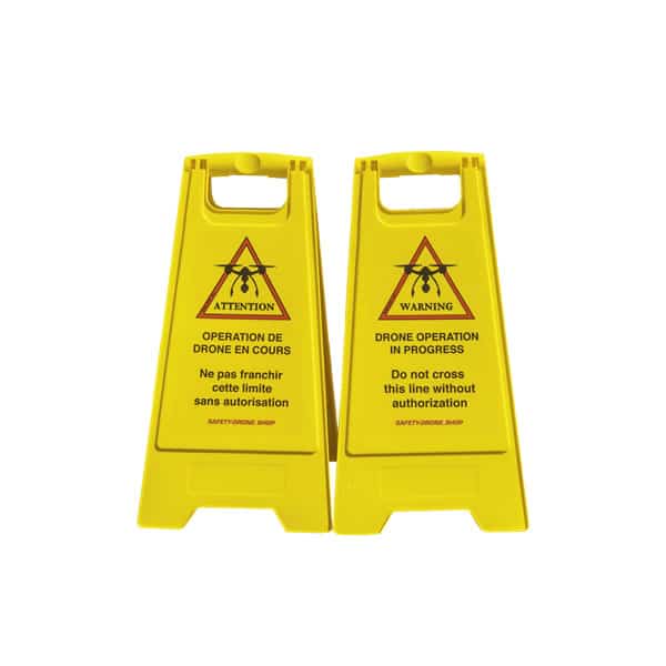 Ces chevalets de signalisation jaunes, avec le texte d’information en français sur la face recto et anglais sur la face verso et les pictos en couleur, vous permettront de sécuriser vos opérations de drones au sol, notamment pour matérialiser la zone dite d’exclusion des tiers, prévue par la réglementation française. Vous pouvez sélectionner de 1 à 12 chevalets (tarif dégressif) lors de votre commande en ligne (plus sur simple demande). Deux options de personnalisations vous sont proposées à partir de 5 exemplaires commandés (lire à la suite).